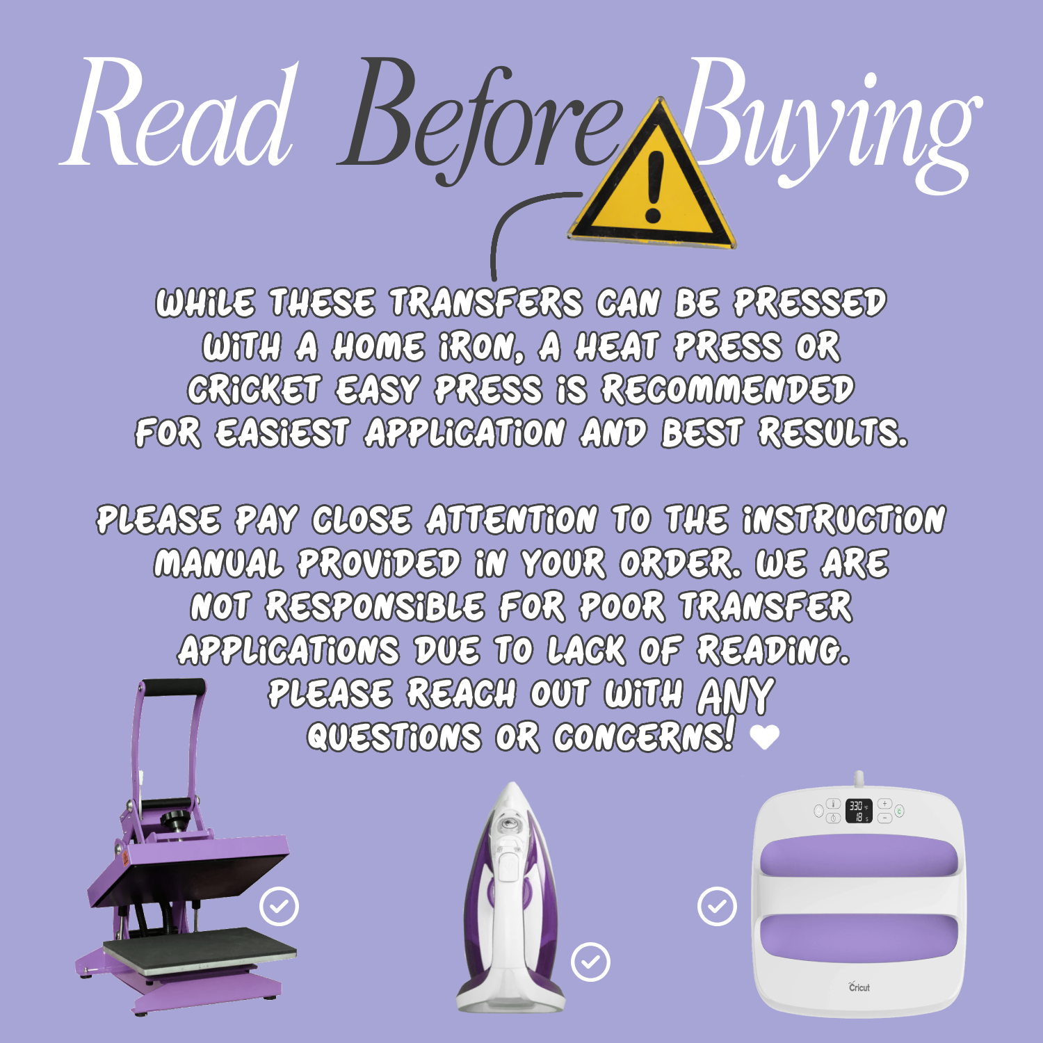 While these transfers can be successfully pressed with a home iron, a heat press or easy press is recommended for easiest application and best results. Please pay close attention to the instruction manual provided in your order. We will also provide a few video links for visual instructions through email! We are not responsible for poor transfer applications due to lack of reading or following direction.